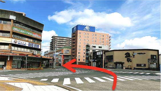 スクランブル交差点を北に向かって進みます。※ABホテルを目印に北に直進します。